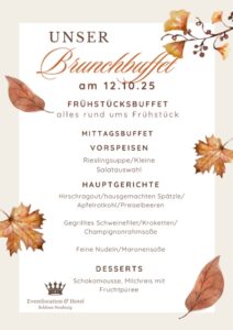 12.10.25 Brunch von 9.00 -14.00 Uhr Alles rund ums Frühstück und ab 12.00 Uhr geht es über ins Mittagessen.